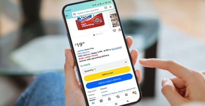 يبدو معرفة العناصر المؤهلة بسيطة بما فيه الكفاية. إذا كان يمكن إضافة العنصر الذي تشاهده إلى عمليات التسليم التي تصل في وقت لاحق من اليوم أو غدًا ، فسترى إضافة أزرق جديد إلى زر التسليم أسفل الزر الأصفر القياسي من Amazon. يضيف النقر على الزر على الفور العنصر إلى التسليم القادم ، ولكن إذا ضغطت عليه عن طريق الخطأ ، أو تغيير رأيك بسرعة ، فإن خيار التراجع سيقوم على الفور بإزالة العنصر من الطلب.