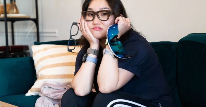 لقطة مقرّبة لكبيرة المراجعين فيكتوريا سونغ وهي تفكر في خيارات حياتها بينما تحمل نظارتين ذكيتين وأربعة أجهزة يمكن ارتداؤها على المعصم وخاتمًا ذكيًا وقلادة Friend AI.