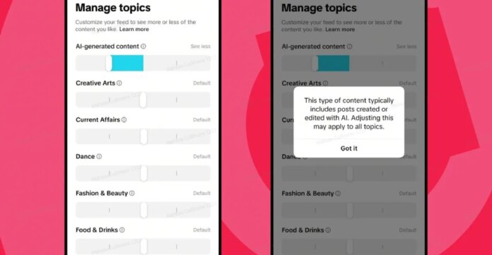ال شريط تمرير جديد للذكاء الاصطناعي سيظهر جنبًا إلى جنب مع عناصر التحكم الأخرى في محتوى TikTok ضمن “إدارة المواضيع”، والتي تتيح للمستخدمين حاليًا تحديد مقدار ما يريدون رؤيته من مناطق المحتوى بما في ذلك الرقص والشؤون الجارية واللياقة البدنية. تمامًا مثل أشرطة التمرير هذه، سيسمح عنصر تحكم الذكاء الاصطناعي للمستخدمين بطلب رؤية المزيد أو أقل من مواد الذكاء الاصطناعي، بمستويين في أي من الاتجاهين.