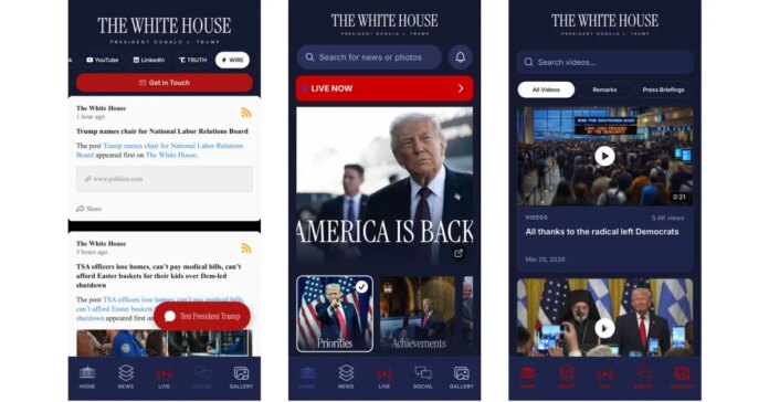 تطبيق رسمي جديد للبيت الأبيض أندرويد و دائرة الرقابة الداخلية يأخذ المحتوى من موقع البيت الأبيض وينسخه إلى تنسيق التطبيق. أ سقسقة ظهر الإعلان عن التطبيق صباح الجمعة إلى جانب مقطع فيديو يمزح حول إطلاق الصواريخ والذي يبدو أنه يحتوي أيضًا على جهاز iPhone، بدلاً من المراوغة. ترامب فونه. لا توجد معلومات عن الميزات الحصرية أو الروابط مع الهاتف أو خدمات Trump Mobile.